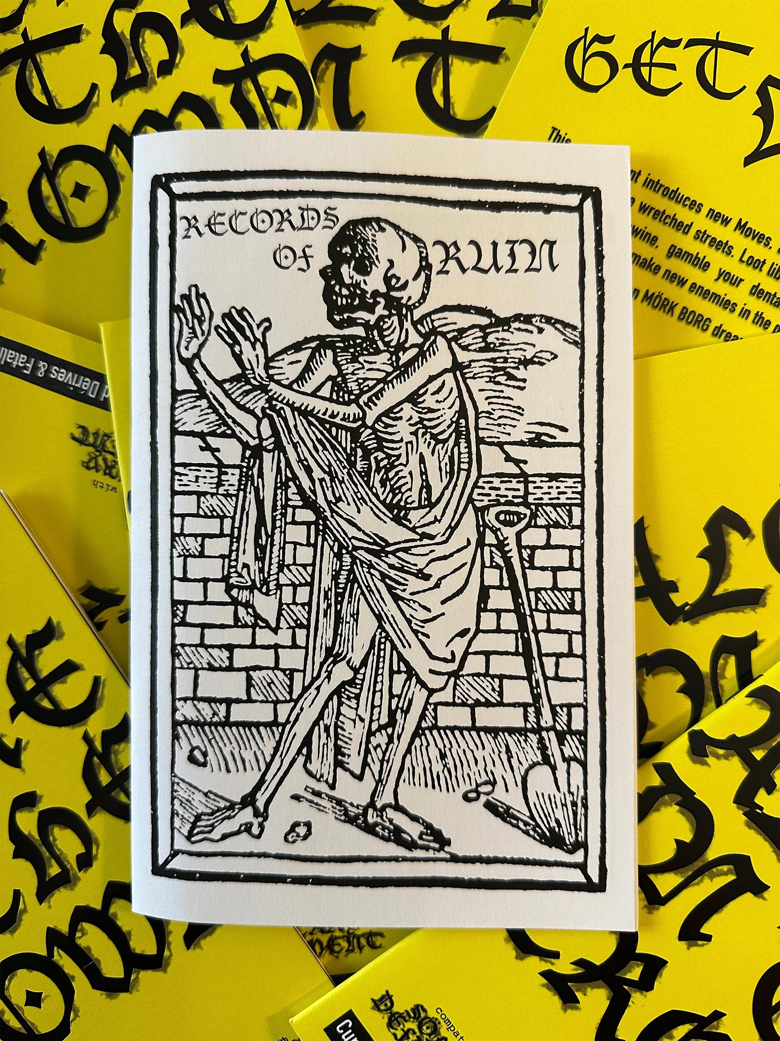 Records of Ruin is a 28 page campaign journal zine saddle-stitched with black staples. It includes;