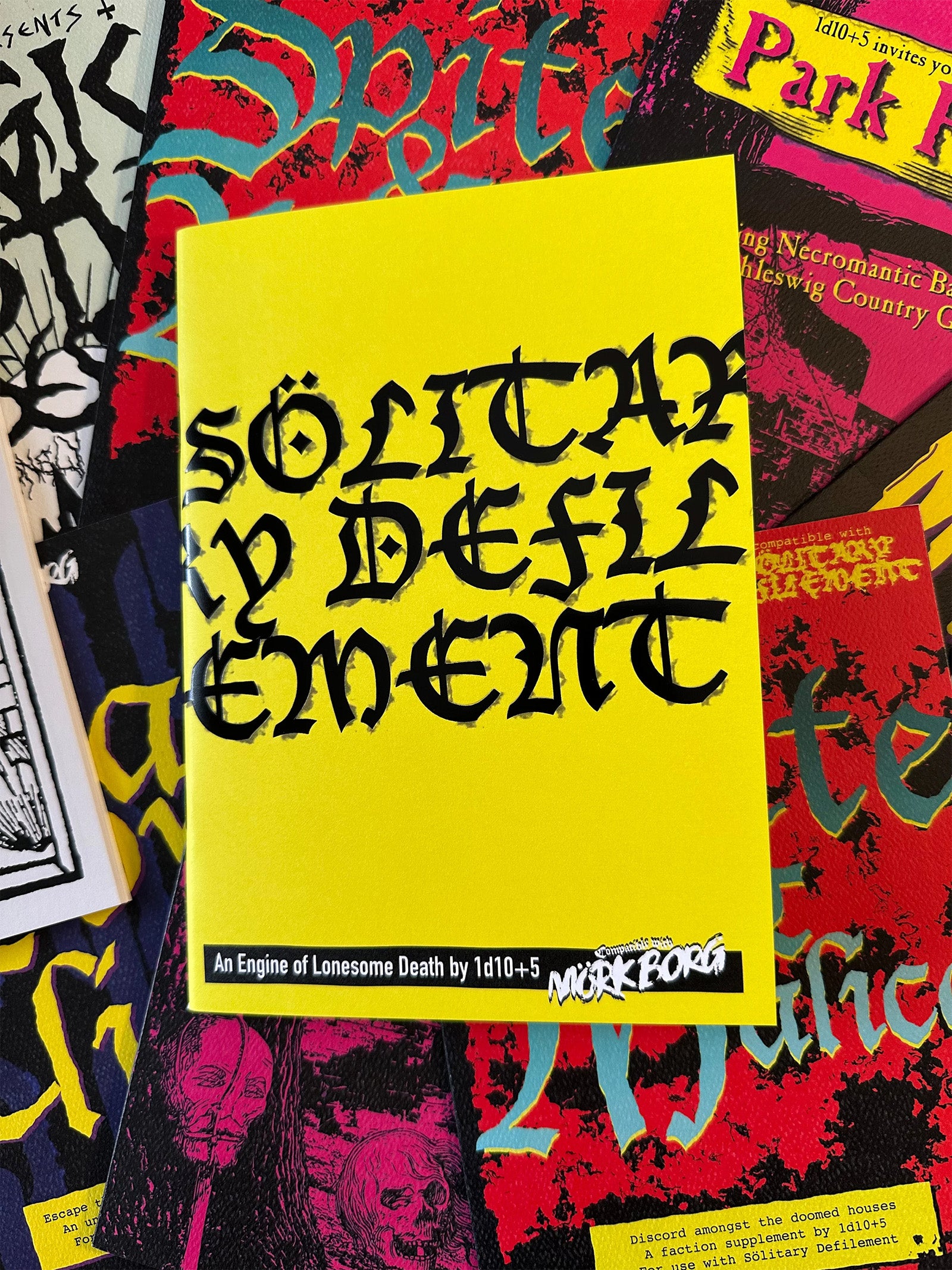 The Sölitary Defilement Box Set is an independent production by 1d10+5 and Max Moon Games and is not affiliated with Ockult Örtmästare Games or Stockholm Kartell. It is published under the MÖRK BORG Third Party License.