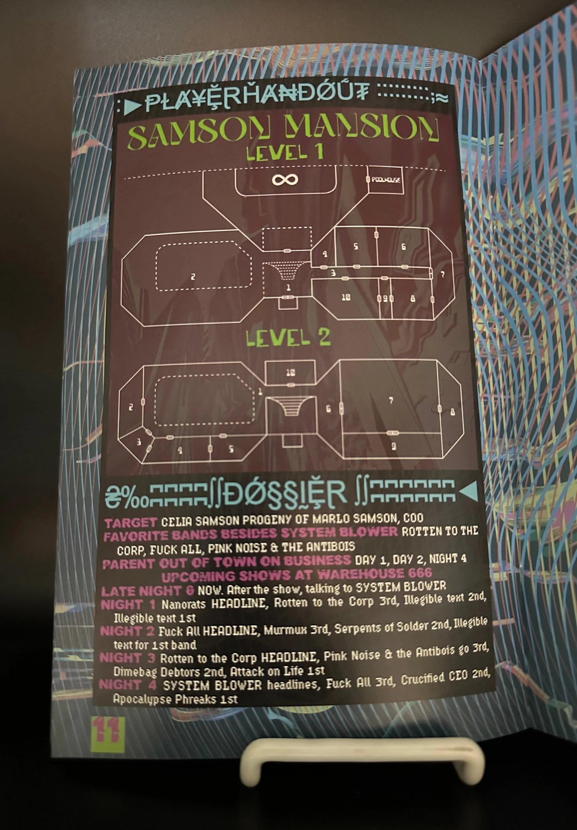 SYSTEM BLOWER has a job for you. Turns out that Celia Samson, the teen progeny of that moron exec at the top of this hill, Marlo Samson, is a huge SYSTEM BLOWER fan but hasn't gone full System Blower Army yet. This is where you come in. SYSTEM BLOWER has a plan that's going to get creds, piss off the hegemony, and stir up a media storm like never before. All you need to do is pull off this heist and create a scene so no one misses it! It would be great if you survived it...but that's not the point. Raid the mansion. Kidnap or convert Celia Samson to the cause, doesn't matter which, just be sure to get her to the finale show before soundcheck...and then it's time to BLOW THE SYSTEM!!!!